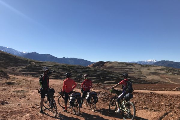 La route nous fera monter dans des pistes encore oubliées et bordées de belles montagnes. Nous traverserons un parc national et gravirons des cols. À 2 200 mètres d'altitude, vous serez émerveillés par la vue à couper le souffle, tout en faisant une pause thé à la menthe avant que ne commence la descente qui nous mènera vers la fin de notre expérience de VTT au Maroc.